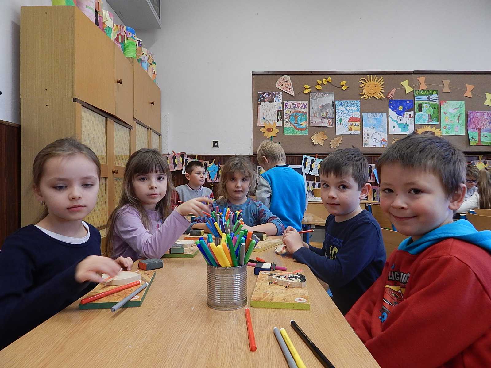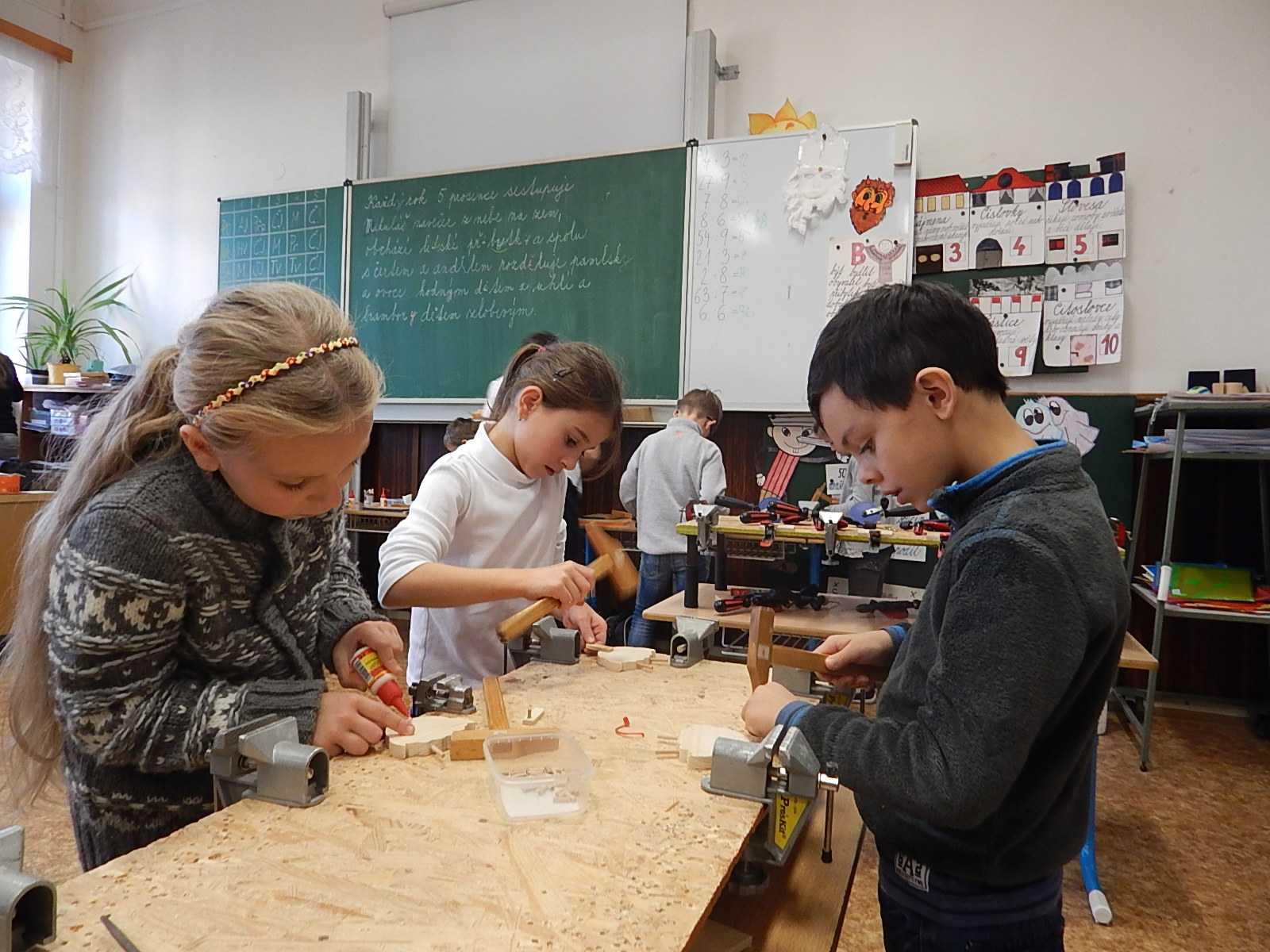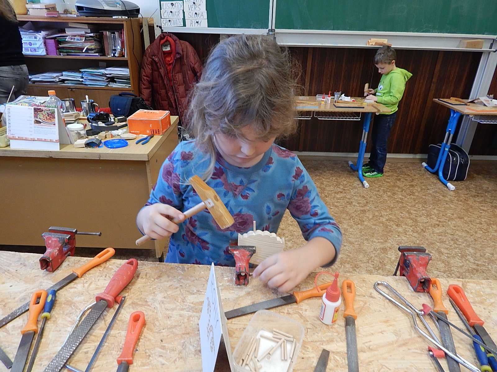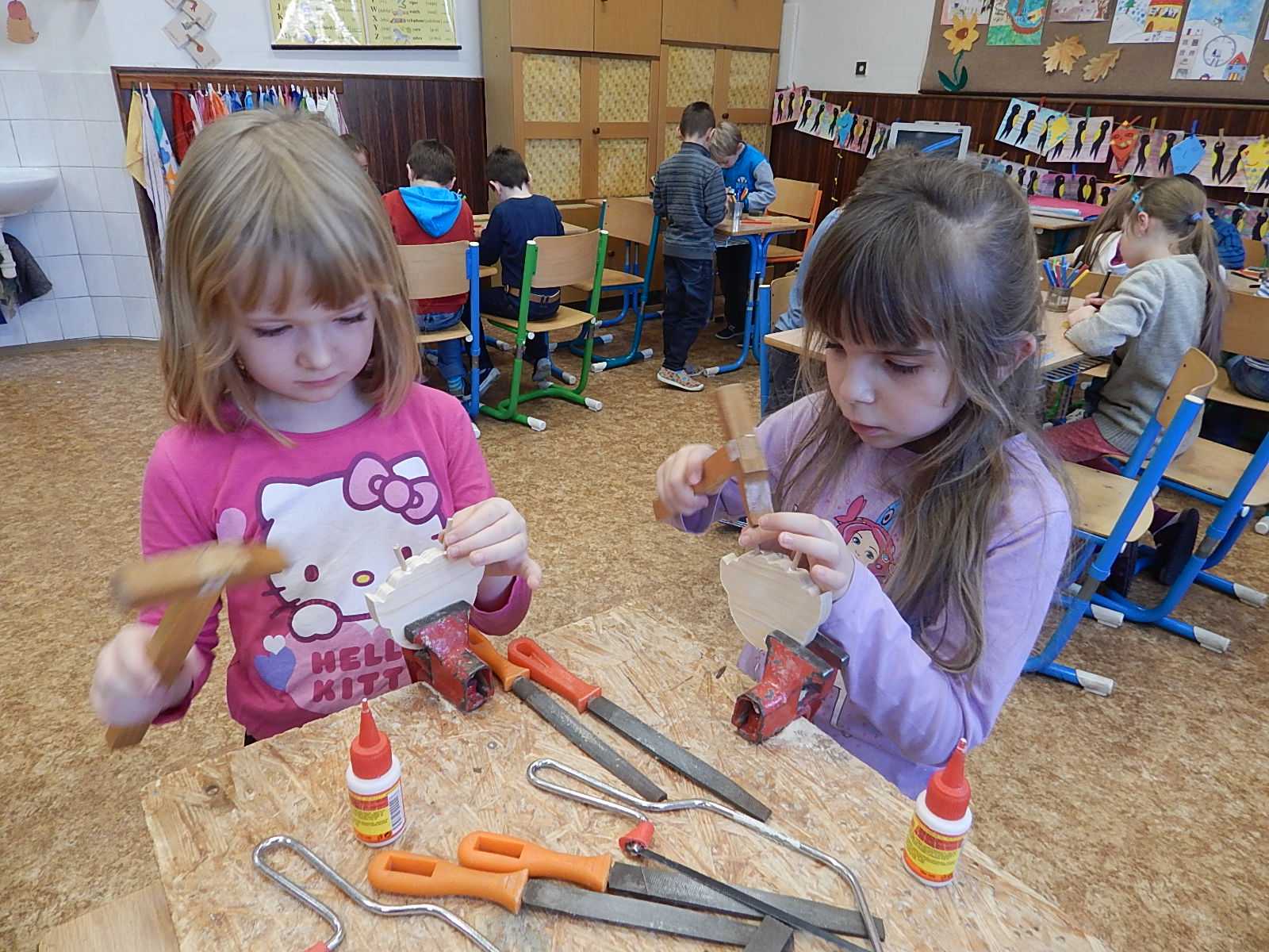 V měsíci prosinci navštívila naši školu paní architektka Cejhonová s Dřevíčkovou dílničkou. Děti měly možnost vyrobit si ze dřeva předměty spojené s Vánoci - čerta, Mikuláše, andílka a další. Hodinu intenzivně pracovaly s nářadím, jako ruční vrtačkou, svěrákem, šroubovákem a dalším. Nářadí bylo přizpůsobeno jejich věku. Potom ještě výtvarně zpracované dřevo dotvořily.