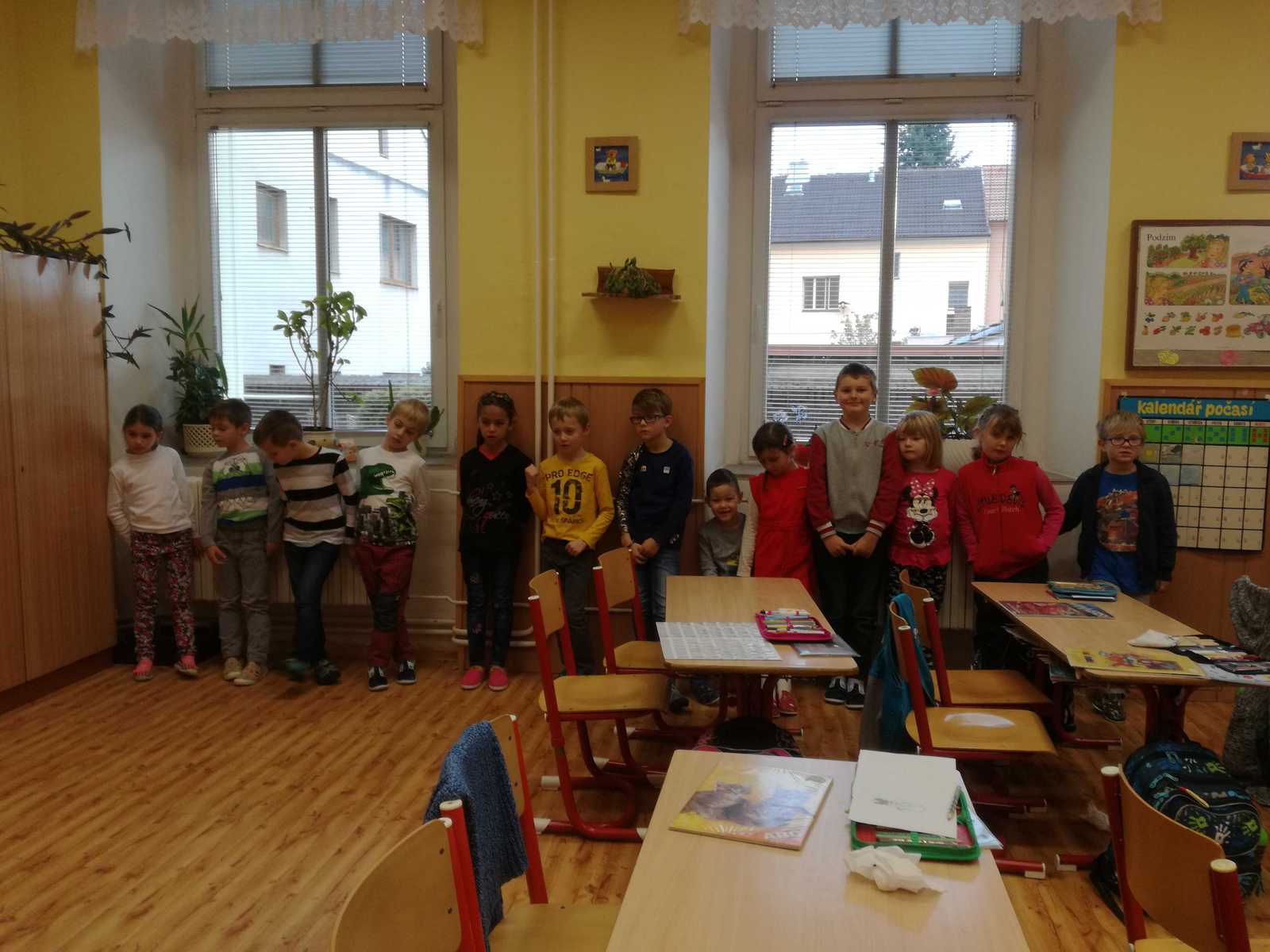 Listopad proběhl na téma Rodina, téměř všichni děti si přinesly fotografie své rodiny, které jsou vystavené na tabuli. Při českém jazyce žáci poznali novou hru, Rybník. Rybník (koberec) přejde jen ten, kdo umí dobře číst a čtením slov nebo slabik ,,přeskáče po kamenech na druhý břeh“. Velký zážitek žáci měli, když se šli podívat na tři své spolužáky na představení do divadla. Třídy dětem zdobí jejich výtvory k tomuto projektu.