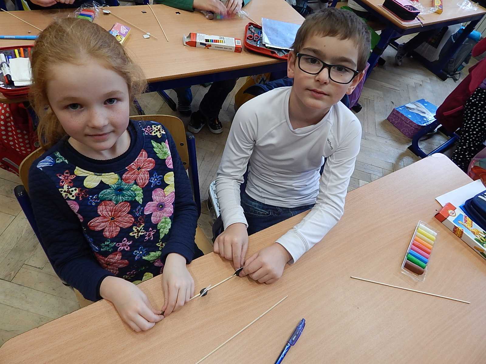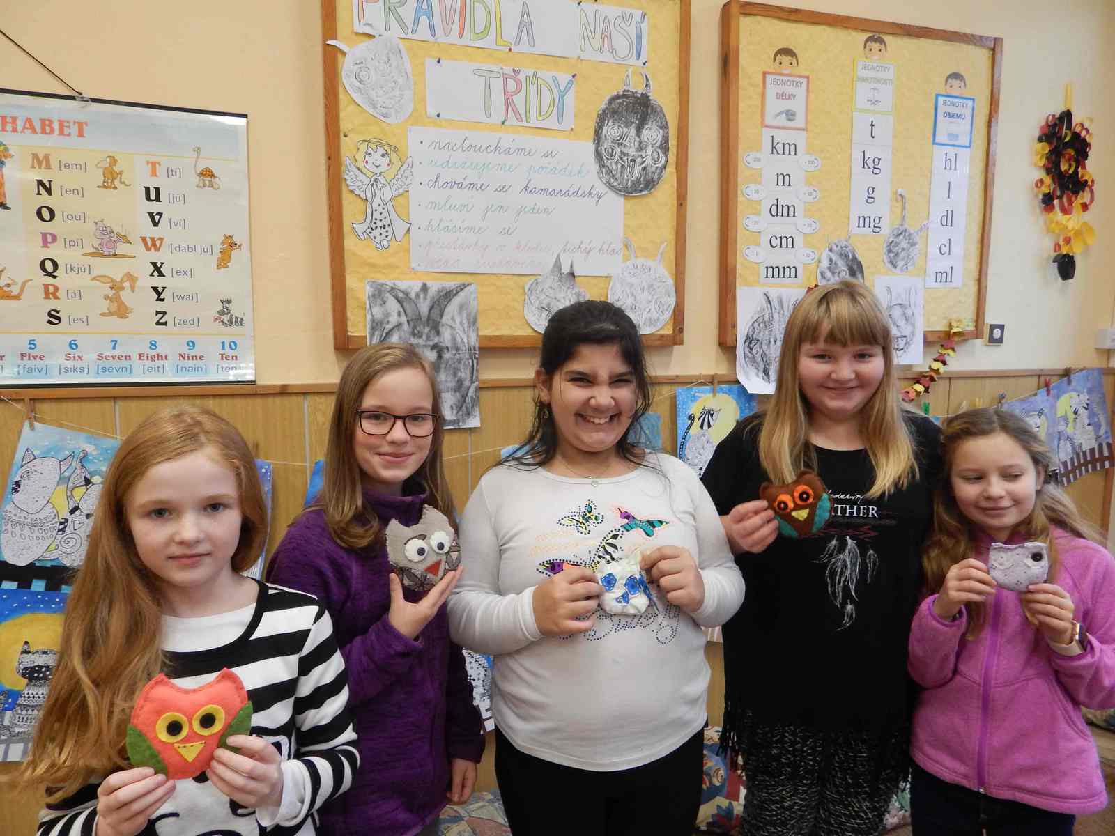 Žáci čtvrtého ročníku šili jednoduchými stehy sovičky. Zpočátku vypadal úkol náročně, ale radost z výsledného výrobku dala na námahu zapomenout. Někteří pak radostně šili pro své příbuzné další a další sovičky.