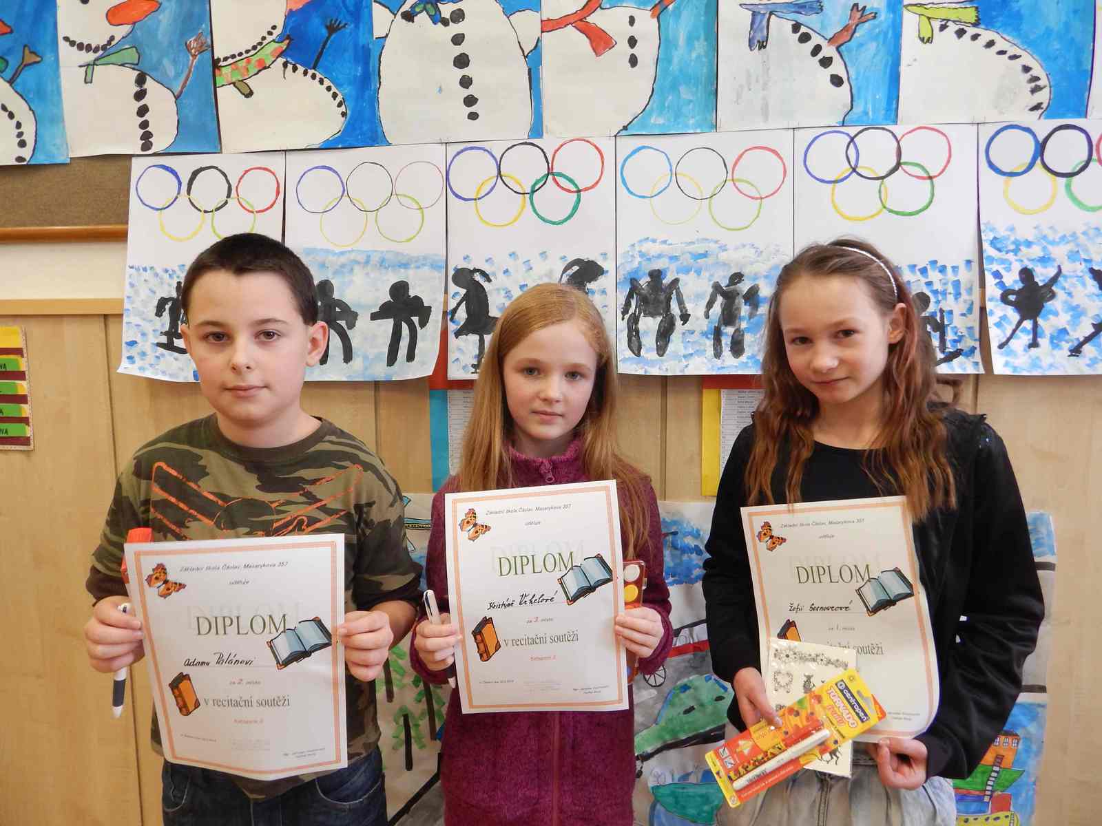 Ve školním kole recitační soutěže první tři místa obsadili Adam Palán, Kristýna Vrhelová a Žofie Sosnovcová. Gratulujeme.