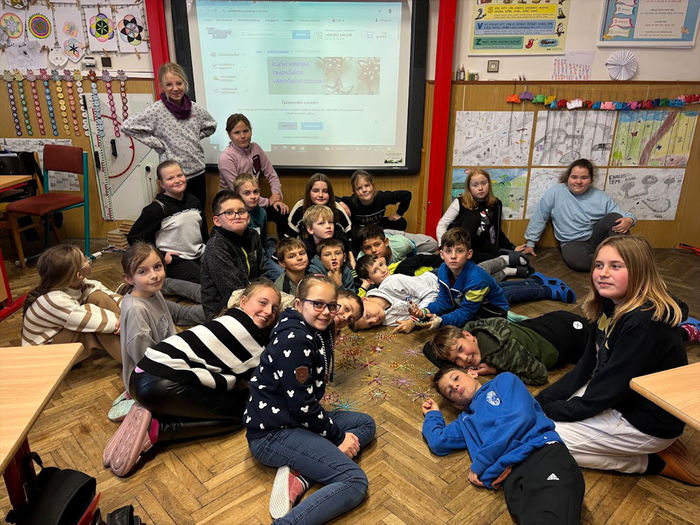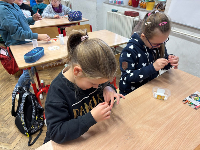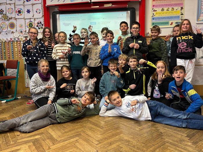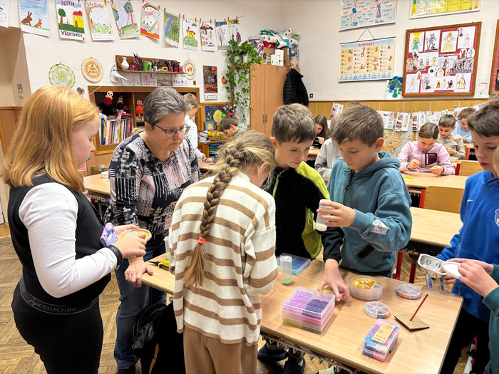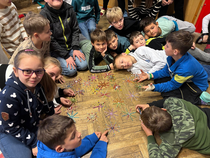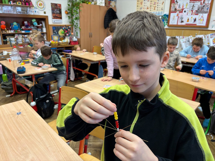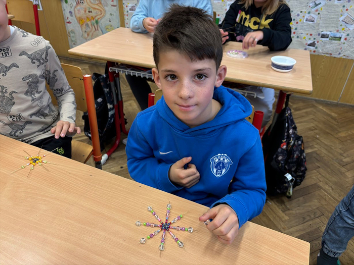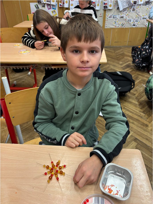 Skleněné korálky jsou českým tradičním artiklem a pro naše domácnosti byly i vždy dostupným materiálem. Korálkové hvězdičky, vločky i jiné vánoční tvary se jako náhrada foukaných ozdob či doplněk slavnostní výzdoby vyráběly v českých domácnostech již před několika dekádami. Žáci na jednoduchý drátěný polotovar navlékali korálky podle své fantazie a vyrobili si vánoční vločku. Při tvoření procvičovali jemnou motoriku a hlavně i trpělivost. Domů si každý žáček odnesl jednu či dvě korálkové ozdobičky na stromeček. Korálkohraní se nám moc líbilo a získali jsme další novou zkušenost.