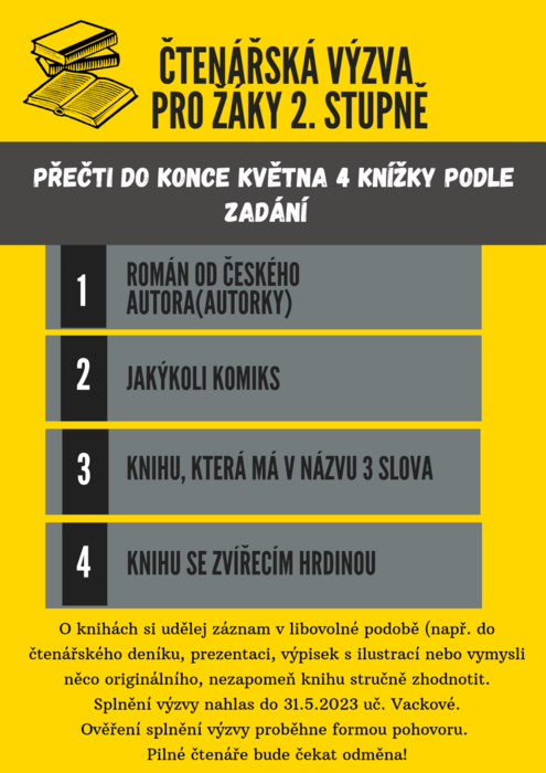 V březnu – měsíci knihy jsme se rozhodli oslovit všechny čtenáře na 2.stupni čtenářskou výzvou, jejímž smyslem je ukázat, že čtení je nejen zdrojem získávání informací, ale může nás i bavit a přinášet nám potěšení ve formě čtenářských zážitků. Pokaždé, když otevíráme knihu, odehrává se mezi okem a povrchem papíru malý zázrak – řádky písmen náš mozek proměňuje v obrazy, myšlenky, pachy a hlasy. Literatura umožňuje přenos těch nejsložitějších životních zkušeností, otevírá před námi cizí životy. Plodné čtení je vždy spojeno s porozuměním a prožíváním ... a to je na čtení to nejkrásnější, že působí nejen na náš rozum, ale i na city.