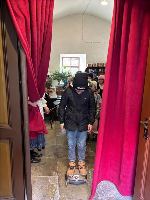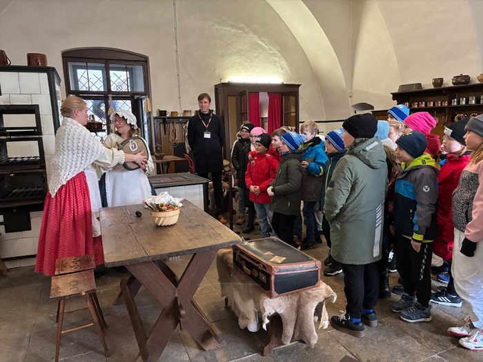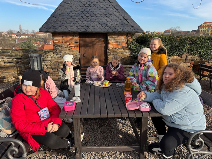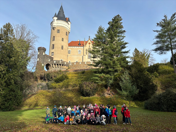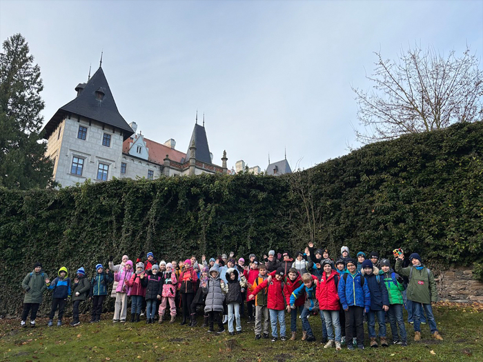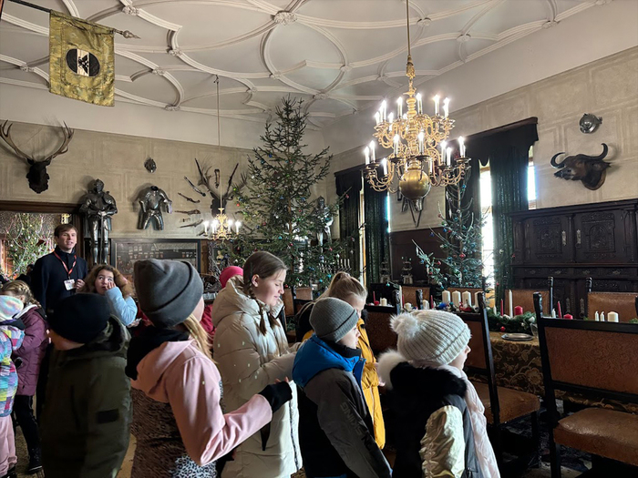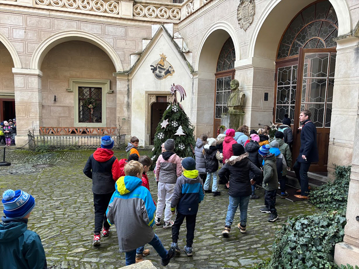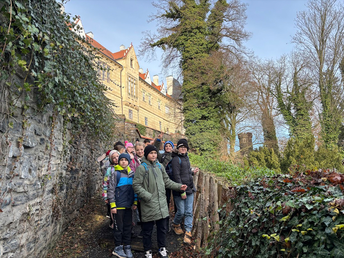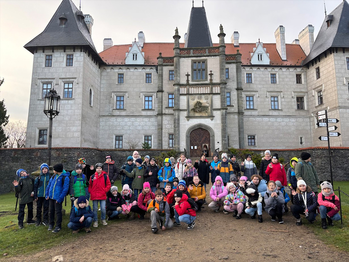 Při vánočně laděné prohlídce slavnostně vyzdobenými zámeckými salóny a pokoji nám pan průvodce řekl něco málo z historie zámku. Vyprávěl nám o tradičních vánočních zvycích, ale i o těch dávno zapomenutých. Žáci dostali rozličné hádanky a otázky a do povídání se aktivně zapojovali. Navštívili jsme sladce provoněnou historickou kuchyni, kde nám zámecké kuchařky daly něco dobrého na zub. Na rohaté čertovské váze zvážily naše hříchy a s legrací nám bylo oznámeno, zda půjdeme do nebe či do pekla. No a hádejte, jak to asi dopadlo. Naši malou exkurzi do minulosti jsme zakončili prohlídkou zámeckého parku. Svítilo nám krásně sluníčko a domů jsme odjížděli s příjemnou vánoční náladou.
