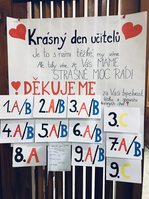 Na den učitelů si připravili žáci naší školy pro učitele překvapení. Žáci devátého ročníku pod vedením Kláry Reslové a Vojtěcha Vavřiny zorganizovali akci, která připomněla odkaz Jana Amose Komenského. Popřáli učitelům, předali jim přáníčka a obrovskou kytku a předali plakát podepsaný od všech žáků školy.