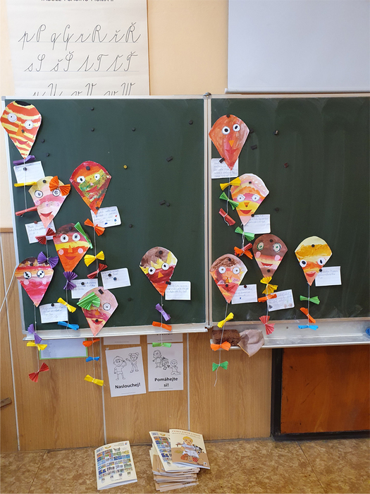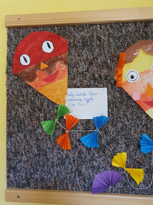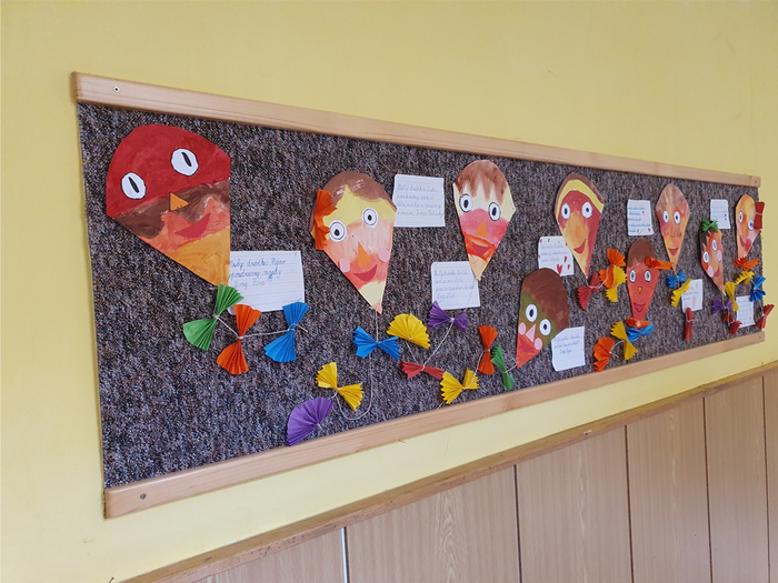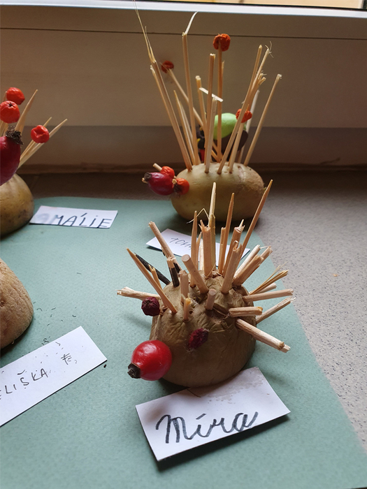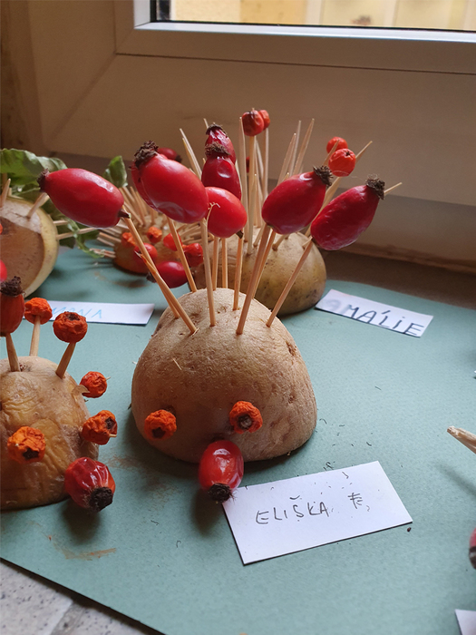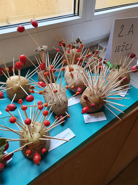 Žáci II.A o Praktických činnostech vyráběli ježky z brambor, šípků a dalších přírodnin. V hodinách Výtvarné výchovy děti vyrobily papírové draky, kterým napsaly pozdrav.