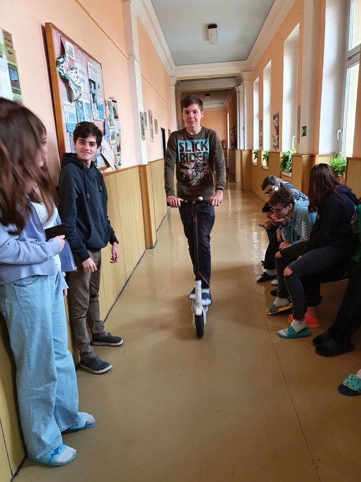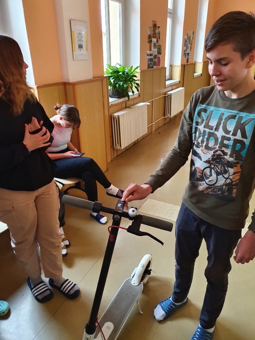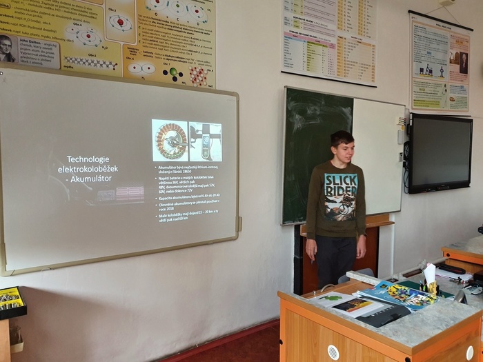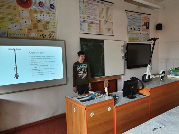 Jedním z témat výuky fyziky devátého ročníku jsou Zdroje elektrické energie a jejich využití. Na toto téma si připravil žák Petr M. velmi pěknou prezentaci o elektrokoloběžkách. Své spolužáky v ní seznámil s částmi elektrokoběžky, kde je uložena baterie, jaké má parametry a další. Svou prezentaci vylepšil i tím, že samotnou elektrokoloběžku přinesl a předvedl.