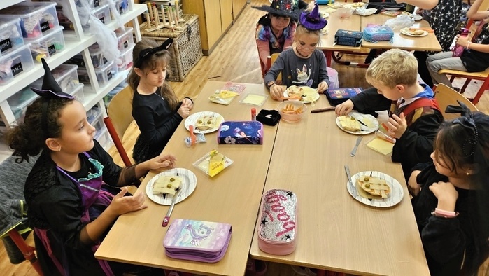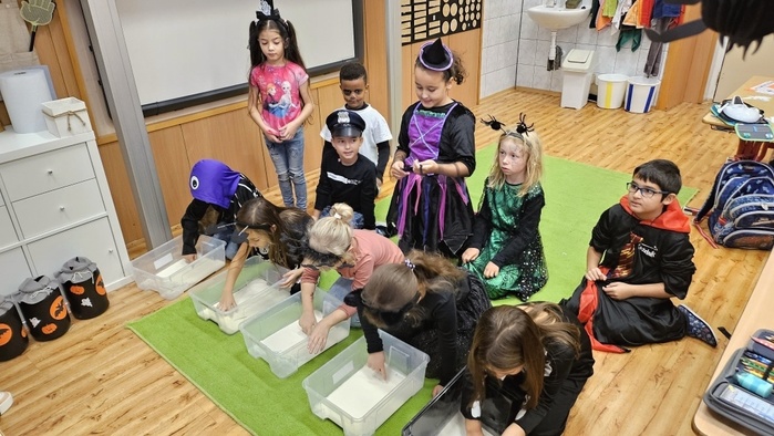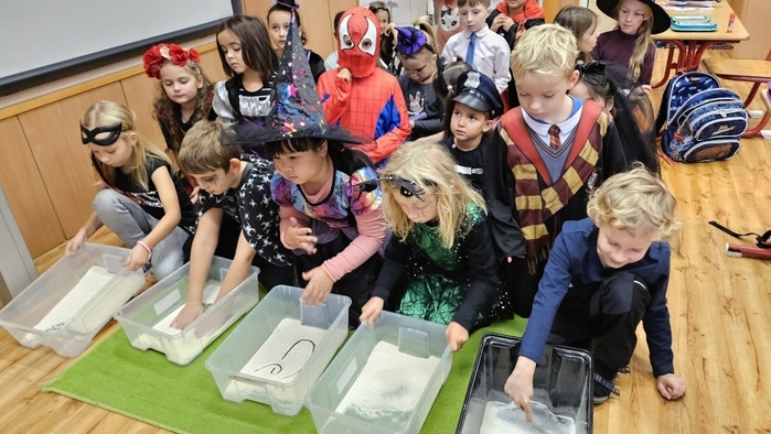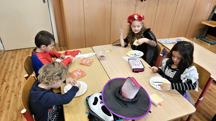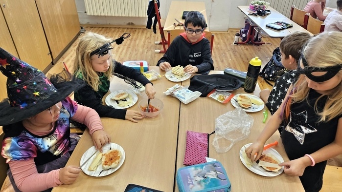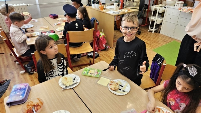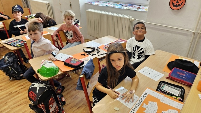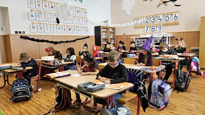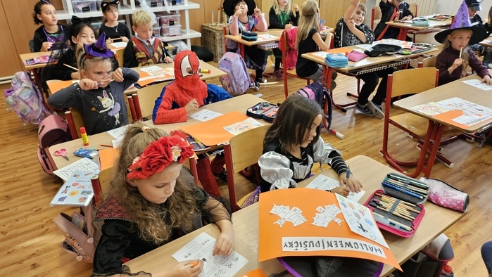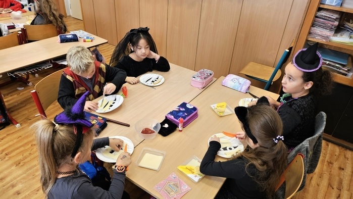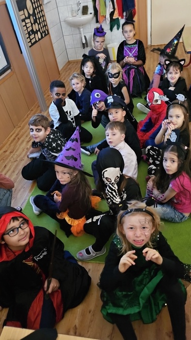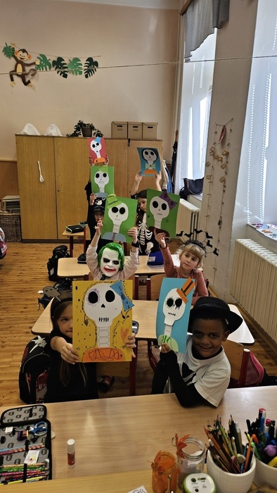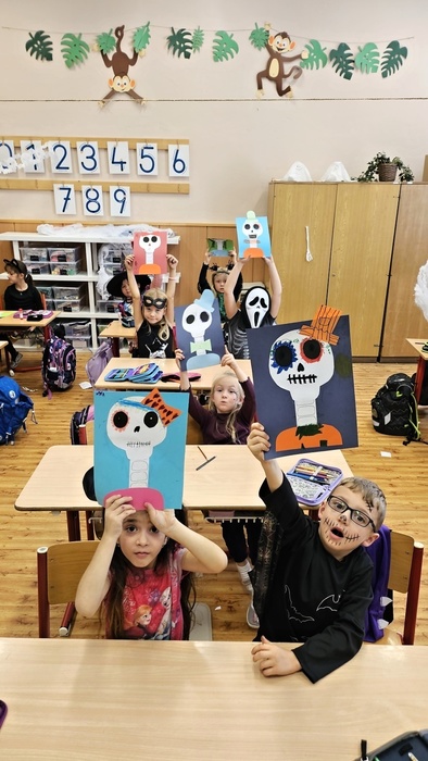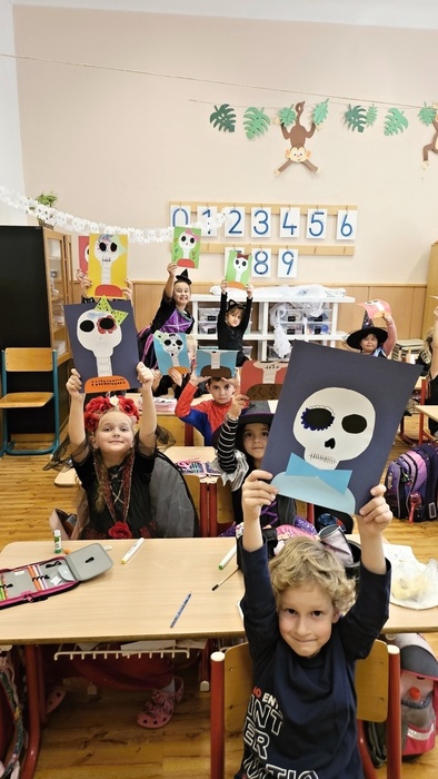 V pondělí 30. 10. na děti z 1. B čekala strašidelná výzdoba třídy. Sami žáčci se převlékli do kostýmů a spolu s paní učitelkou i asistentkou oslavili Halloween a připomněli si Dušičky. Plnili úkoly z českého jazyka, matematiky, vyrobili si svačinku a nazdobili papírového kamaráda Kostíka. Společně si zazpívali a zatančili na písničku o Strašidlech. Nechyběly ani hry a soutěže. Všichni si den náramně užili.