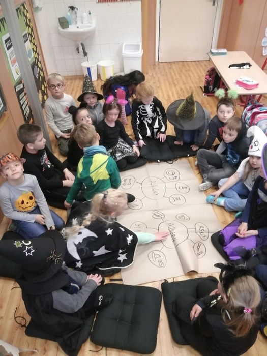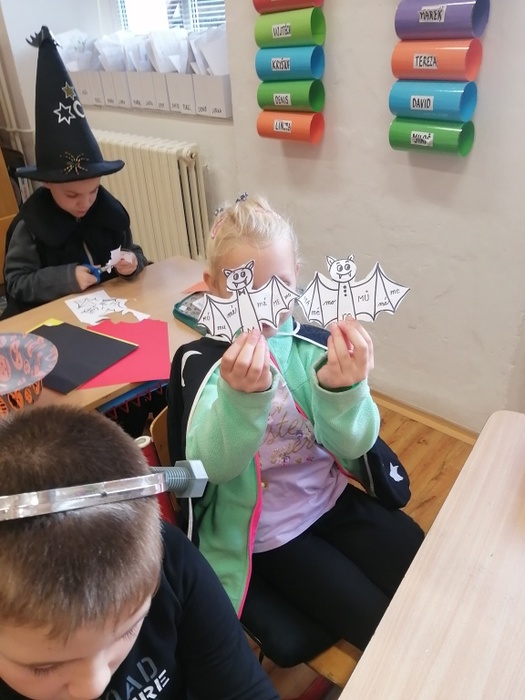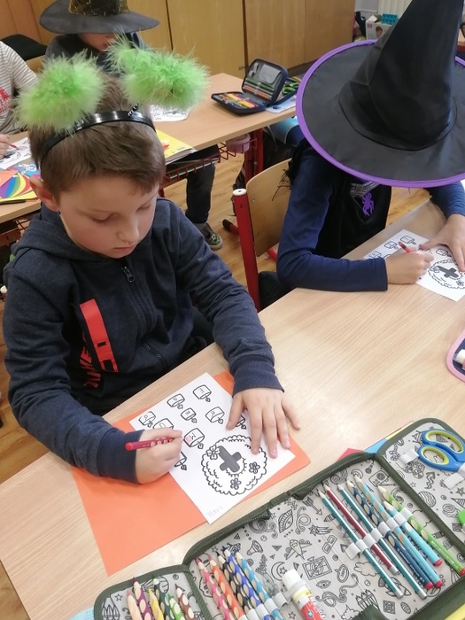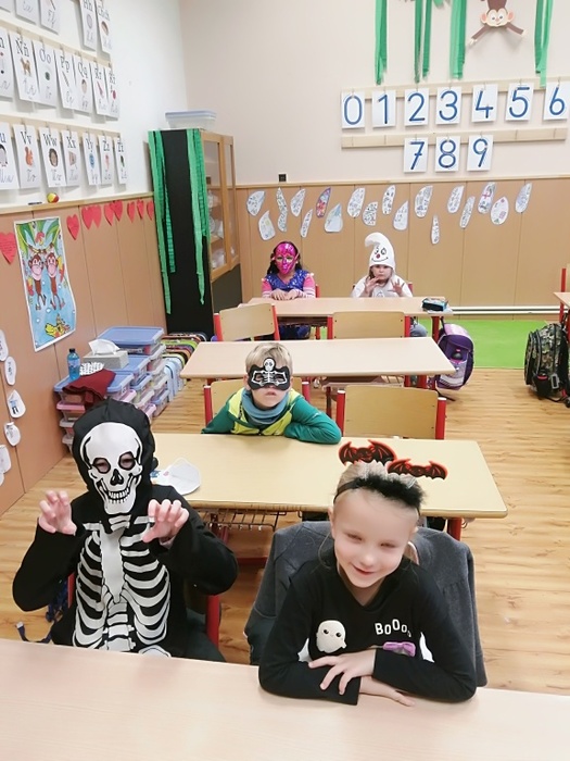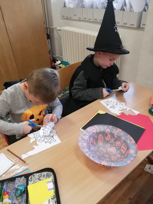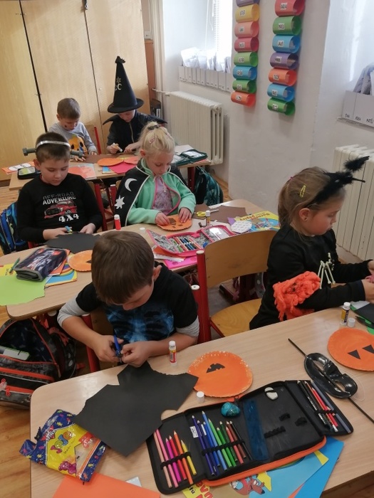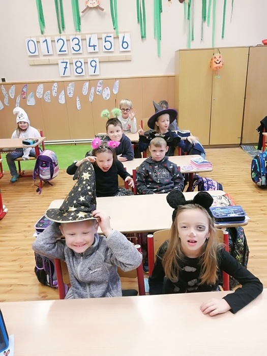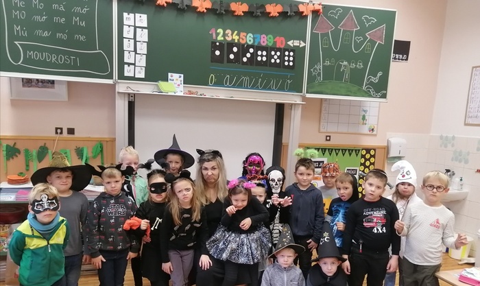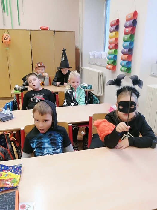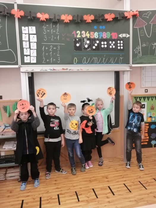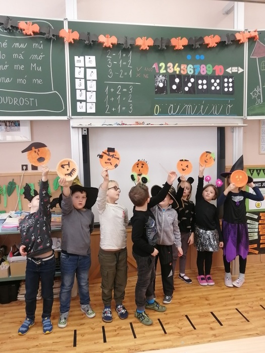 Poslední den před podzimními prázdninami prvňáčci oslavili Halloween a připomněli si svátek Dušiček. Převlékli se do kostýmů. Vzpomněli si na své blízké, kteří již s námi nemohou být. Zazpívali si i zatančili. A v neposlední řadě si vyrobili papírovou dýni. Všem se to podařilo skvěle.
