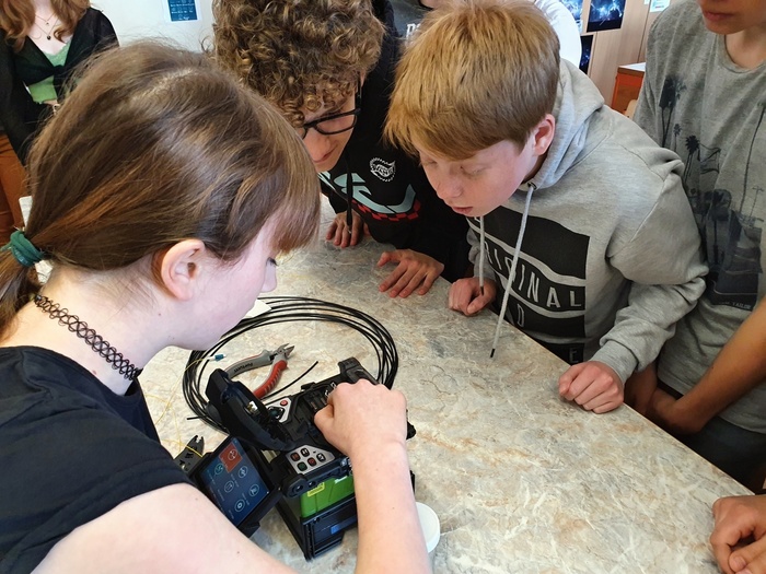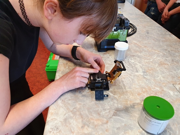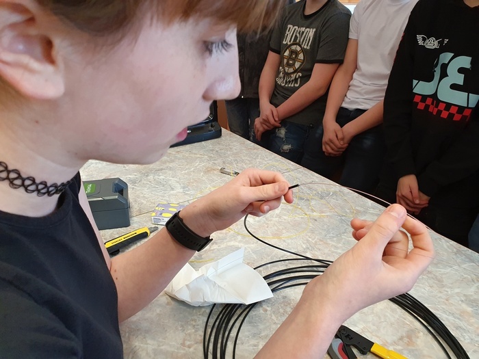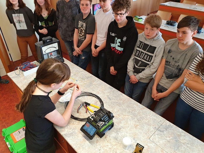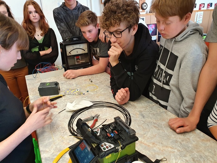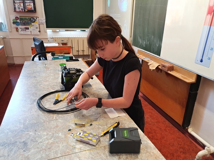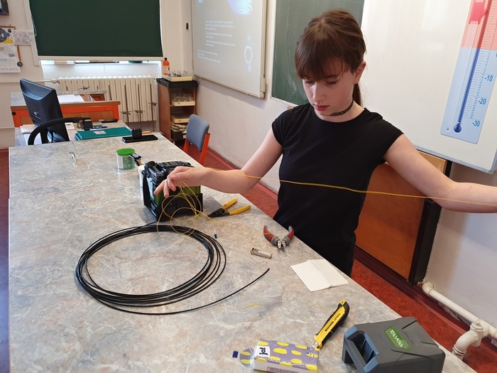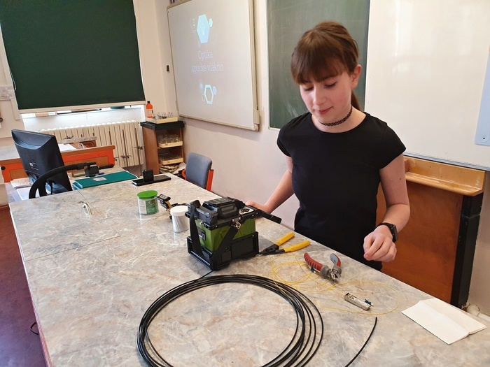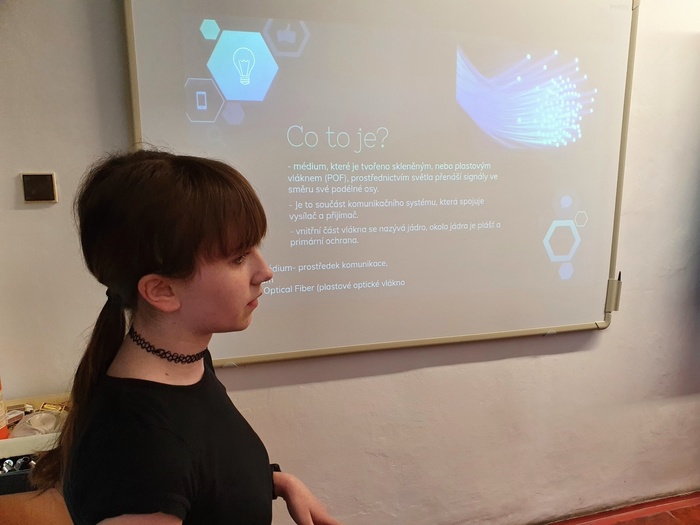 V rámci rozšířené výuky fyziky si žáci pravidelně připravují fyzikální pokusy a předvádí je ostatním spolužákům. Tentokrát místo pokusu na všechny čekala velmi zajímavá prezentace. Tu si připravila Natálie Veselá. Tématem bylo vysvětlení, jak funguje optické vlákno. Natálie nejdříve vysvětlila princip činnosti a potom předvedla i praktickou ukázku. Ta byla spojena i s tím, jak se optická vlákna svařují. Všichni, včetně vyučujícího, byli z předvedené práce Natálie nadšeni!