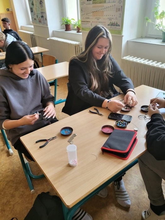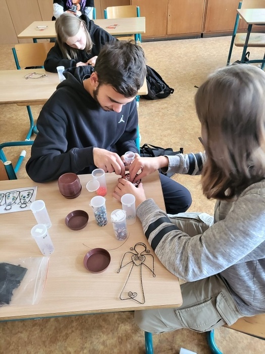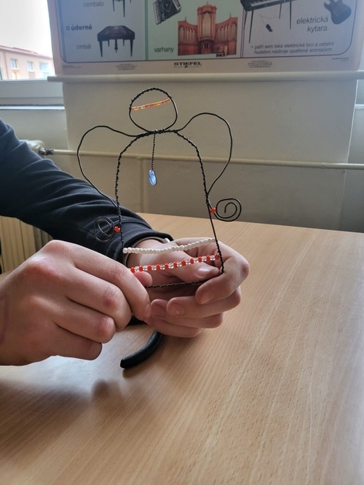 Třída 9.A si po čase opět zpestřila předmět praktické činnosti vlastnoruční výrobou, tentokrát vánoční dekorace. Žáci vytvářeli jeden z vánočních symbolů, anděla. Základními materiály byly různě silné drátky a různobarevné korálky. Děti dostaly šablonu, kterou, na základě své fantazie a vkusu, dozdobily. Ověříly si svoji trpělivost, pečlivost a jemnou motoriku. Nakonec si ale všíchni z hodiny odnesli výtvor, kterým by se nemuseli stydět např. někoho obdarovat. Konečně posuďte sami.