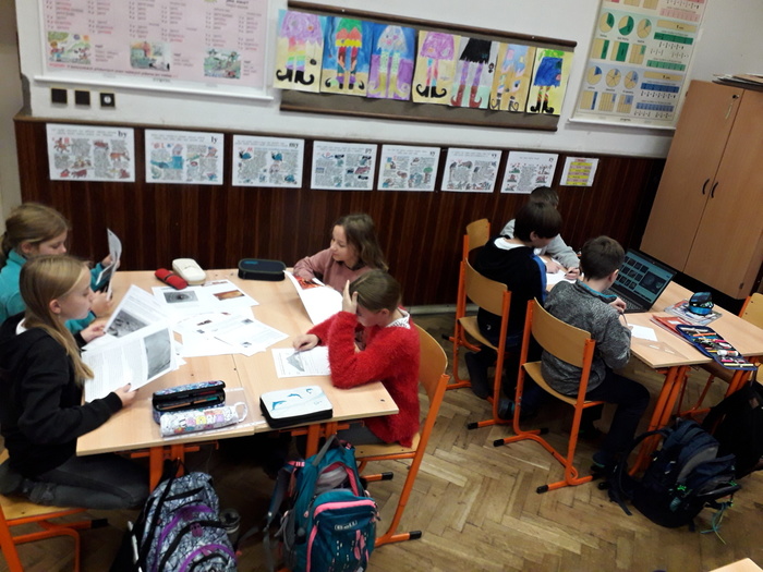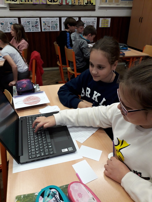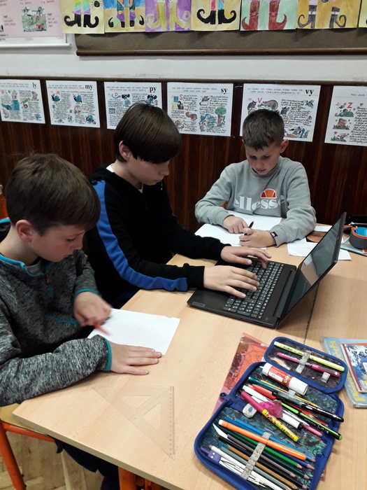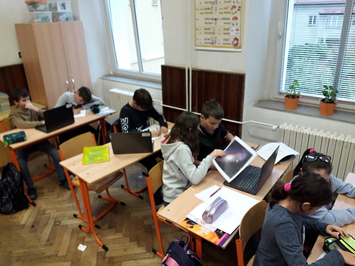 Žáci pátého ročníku už začali pracovat s naší novou mobilní učebnou a to na projektu "Vesmír". S pomocí notebooků vyhledávali potřebné informace na internetu.