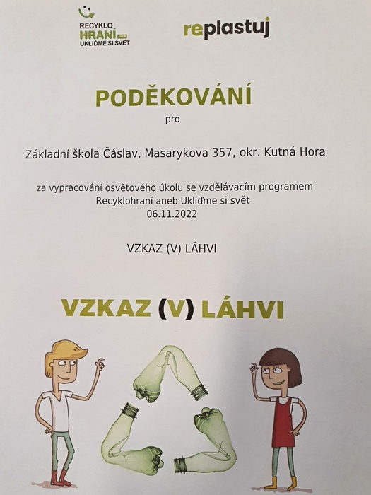 Naše škola již několik let se účastní celoroční ekologické hry - Recyklohraní. Během školního roku žáci plní různé úkoly s tématikou životního prostředí a ekologie. První letošní úkol se nazýval "Vzkaz v láhvi". Žáci plnili úkol o tom, jak správně recyklovat PET lahve. Za odevzdání tohoto úkolu dostala naše škola i poděkování.