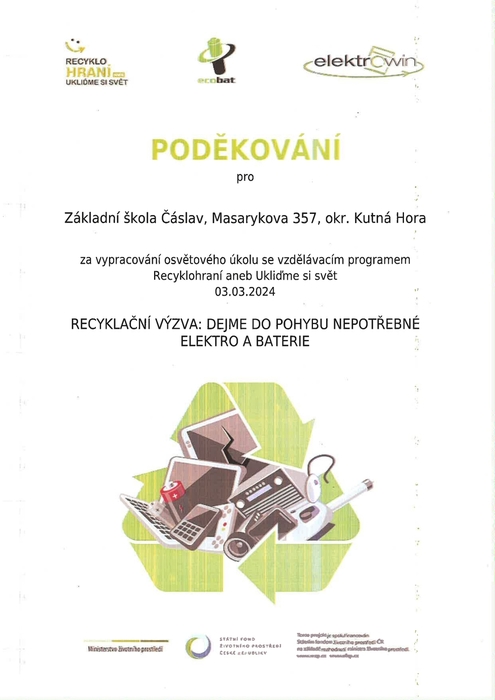 Soutěž Recyklohraní rozvíjí vztah dětí k životnímu prostředí formou tematických her, praktických činností, kvízů a menších projektů, ale také přímou účastí dětí na sběru použitých baterií a drobného elektrozařízení. Naši žáci jsou v této soutěži zapojena už mnoho let. Plní jednotlivé úlohy a ty jsou následně obodovány. Naše škola byla v měsíci únoru celkově čtvrtá v našem okrese.
