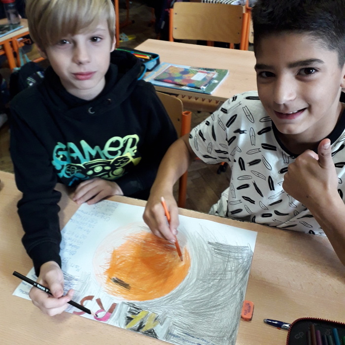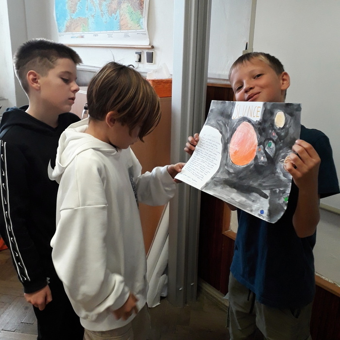 Žáci V.A zužitkovali své knihy a encyklopedie a zpracovali zvolené vesmírné téma podle předem stanovené osnovy. Součástí prezentace výsledků své práce před třídou byly rovněž kontrolní otázky prověřující pozornost spolužáků.